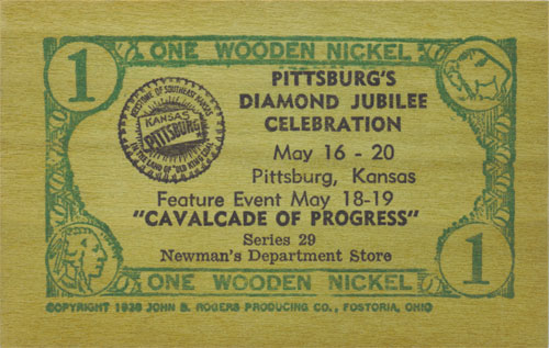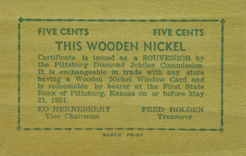 1951 Pittsburg, Kansas Diamond Jubilee Celebration "Wooden Nickel"