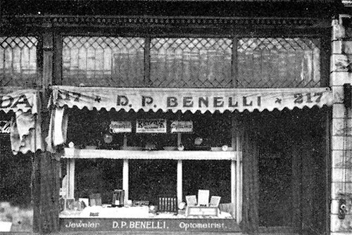 D. P. Benelli started his jewelry and optometrist business in Frontenac in 1902, moving it to Pittsburg in 1914 locating it at 217 N. Broadway in a building that had been built and occupied by George Killiam also a jeweler. Benelli moved his business to 311 N. Broadway in 1927 with his sons operating in this location for many years. His grandson, Bud Benelli, continues in the family business and recently opened a new store in the Stilwell Hotel after his store at 720 N. Broadway was destroyed by a fire in May 2011.