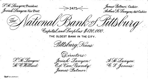 The Bank of Pittsburg, the predecessor of the National Bank, was founded in 1880 by E. G. Chapman and H. Adams of Girard in a small wood frame building between Third and Fourth streets. They only operated the bank for a couple of years before selling it to S. H. Lanyon (president), Frank W. Lanyon (cashier), H. C. Willard and James Patmor (vice presidents). The bank grew rapidly under their leadership, increasing their capital from $10,000 to $50,000 within a few years, incorporating as a national bank in 1886 to become The National Bank of Pittsburg.