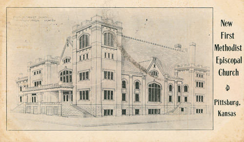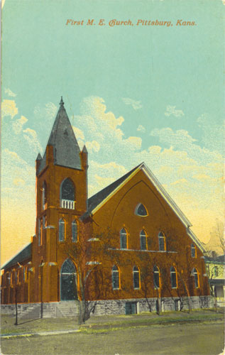 The Methodist Church in Pittsburg began when circuit riders associated with the Mulberry Grove conference rode through the area in 1878, with some of the first services being held in the Kidder School west of Pittsburg. After meeting in various homes for the first few years the members decided that they needed a more permant location. The group was approached by the Tabernacle Methodist Church in Philadelphia, PA with a large donation to build a building if they would call themselves the Tabernacle Methodist Church. A brick building was constructed on the northwest corner of Fifth & Pine, where the Memorial Auditorium is today, and they took the Tabernacle name. The group soon became large enough that the Methodist conference created the Pittsburg-Opolis conference and once again the members began talking about needing a larger building. They discussed adding onto their currrent one but decided they needed a much larger space that would facilitate growth. In June 1892 a new brick church was dedicated on the northeast corner of Eighth and Locust, just south of the new Catholic church. They also changed their name back to the Methodist Episcopal church. By 1911 the church had once again outgrown their building and a discussion began about either building a new larger building or dividing the church into a north congregation and building a new church in the southern area of town for a south congregation. However, it was decided not to divide, so on land donated by member A. H. Lanyon on the southwest corner of Fifth and Pine, directly across the street from where the original church had been, they built a new church that was dedicated in September of 1914. In 1939 the Methodist Episcopal, the Methodist Episcopal South and the Methodist Protestant merged to become the First Methodist church. In 1948 the building was extensively remodeled and the large stone porch entrance was removed. A large annex was added to the south side of the building in the early 1970's and after the YMCA, which was directly south, closed in the early 1980's that building was purchased and torn down adding room for more growth to the south. |