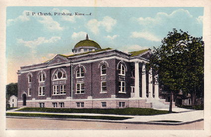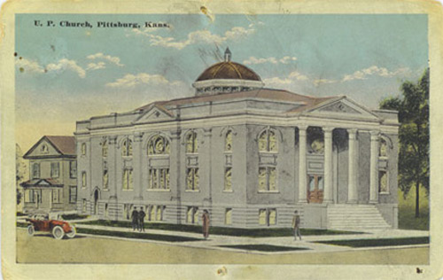 The United Presbyterian Church was founded 29 April 1890 at the home of Mr. and Mrs. J. W. Alexander with 12 charter members. Reverend J. H. Gibson was asked by the Beulah United Presbyterian Church to organize a congregation in Pittsburg where he became the first pastor of the church from 1891 till 1901 when his health forced him to retire. The first congregants met in various homes of members and on the second floor of a building on the northwest corner of Third and Broadway. They were meeting in the old Methodist Church at the corner of 5th and Pine where the Memorial Auditorium is when they built and dedicated a new much larger building on the southwest corner of 4th and Walnut on 21 May 1916. In 1918, Rev. H. Harper Hutchman became the pastor of the United Presbyterian Church and during his first year, the First Congregational Church located at 3rd and Walnut voted to unite with the UP church, starting on February 8, 1919. Rev. Hutchman served until 1940 when he retired at age 78. On January 1, 1986 the two Presbyterian churches in Pittsburg decided to merge and meet in the First Presbyterian Church building at 6th & Pine. The United Presbyterian church property was sold and the building was torn down a few years later with the Roman columns from the front of the church used on the front of the new Sigma Chi Epsilon fraternity house at 1714 S. Broadway across the street from PSU.