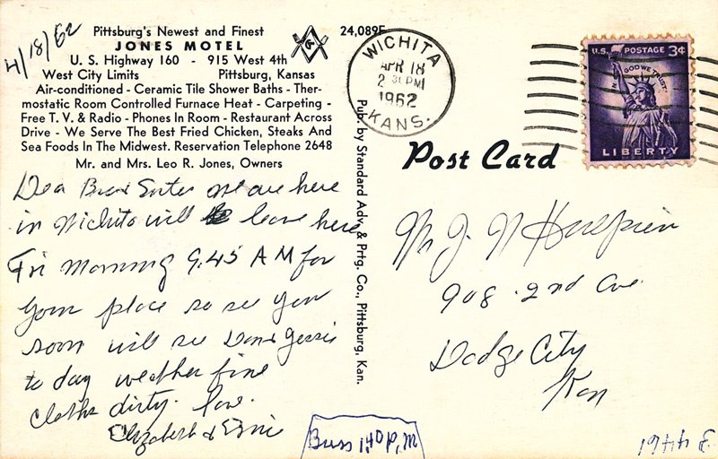 Jones Restaurant and Motel - 915 W. Fourth - postmarked 1962