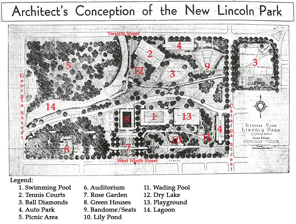 "Above is shown a realistic sketch of the Lincoln Park improvements, including both projects now under way, and possible developments at some future date, as envisioned by the architects, Hare & Hare. As shown in the landscaped drawing several projects are pictured for which no immediate arrangements have been made, but which will be included as further work is done in future years. The drawing depicts the completed whole.