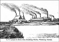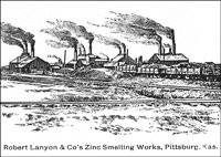 British born Robert Lanyon arrived in the Pittsburg area in the winter of 1878 from his home in La Salle, IL to research the area for the possibility of building a zinc smelter. After finding the area near Pittsburg suitable for the industry due to the abundance of coal, he and his brother S. H. Lanyon built a smelter and named it the Robert Lanyon & Co.'s Zinc Works. It was located just east of the Pittsburg city limits at the time in the area south of Second and Joplin. It began with 2 furnaces, one of which was an 8-kiln Belgian type that had been dismantled and brought to Pittsburg on a train from their smelter in Illinois. In 1880 S. H. Lanyon decided to leave the partnership with his brother and build his own smelter just east of Robert’s called the S. H. Lanyon and Bro. Smelter. That same year William Lanyon, Robert and S. H.’s brother, came to Pittsburg with his son Josiah and opened the W. & J. Lanyon Smelter a little further east in the area around East Fourth where Mission Clay and Schlanger Park is today. Edwin V. Lanyon, Josiah’s son came to Pittsburg a couple of years later and helped his father manage the smelter until 1897. Edwin later became President of the National Bank of Pittsburg and President of the Pittsburg Zinc Co.