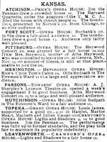 The Opera House soon became a major stop for all traveling circuit shows with reviews being presented in The New York Dramatic Mirror, an industry magazine. Pittsburg even had its own correspondent, Mr. Wyll Watson, who would send his observations back to New York via telegraph or mail to be published. This allowed Pittsburg to have the top stage productions; lectures and artists of the day stop and entertain the citizens, including John Phillip Sousa and his band on 26 Jan 1901. The music was usually supplied by local musician Frank S. Botefuhr and his Orchestra. Scott Joplin who according to his family oral history stated that while in Pittsburg his manager left with all his money and receipts leaving him stranded and not able to pay his boarding house bill. So he left a trunk filled with unpublished music manuscripts, photographs and letters as collateral but never came back to retrieve it. The story was told by his widow Lottie Joplin in 1949 but has never been confirmed. So who knows there could be a trunk in someone’s attic in Pittsburg full of rare Scott Joplin treasures.