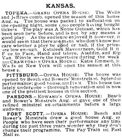 "PITTSBURG -- OPERA HOUSE: Maude Granger, well supported, presented Inherited to a fair house Dec. 15. Sam Jones lectured 17. Daniel Boone 26. == ITEM: Lillian Randal, of the Webber Comedy co., is visiting her parents here." The New York Dramatic Mirror, 2 Jan 1892, p11, c1.