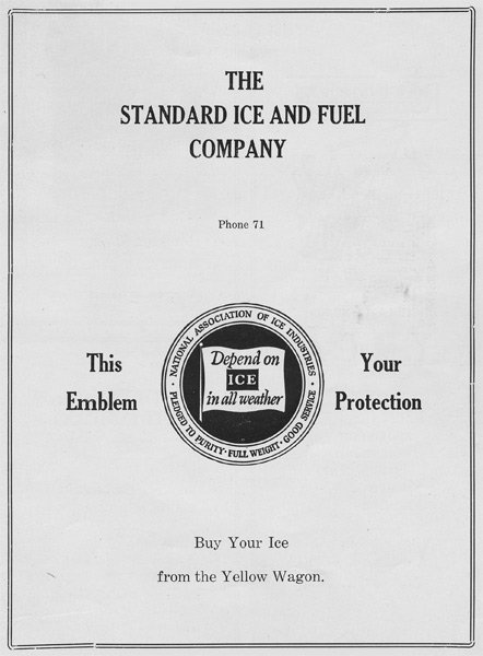 | The Standard Ice & Fuel Company was organized in 1903 by a group of Pittsburg businessmen who saw that as the town was growing the demand for ice also was increasing. They built their first plant at Second and Pine. Their business continued growing so much that in 1910 they built a second $50,000 plant at Sixth and Grand, to distribute ice to the surrounding coal camps and to supply ice for the Kansas City Southern Railroad to use in their cars. In April 1928, the American Service Company purchased the Standard Ice & Fuel Company and continued serving the ice needs of the community with blocks of ice for their "ice appliances." By 1951 it was also selling crushed ice in bags. |