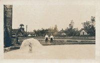 "The above photograph ws taken by F. C. Nichols on July 23, 1904, a few hours after the 60,000 gallon water tank fell from its supporting brick tower. At the time the tank fell, W. J. Lapworth and family were asleep in ther home directly at the foot of the tower. The ceiling of the bedroom was pushed in to a point of eight inches above the bed. The house began to fill rapidly with water. Mr. Lapworth feared all would be drowned. He told Mr. Lapworth and the children to remail quiet while he crawled out of through a hole for help. A few minutes later, the members of the family were assisted out of the debris and water. The children were sleeping "ball-fashion," and the end of their bed was crushed. The falling water had sufficient force to break through the roof and push out the walls. Howard Opie, who had been fireman at the plant only three days, barely escaped with his life and was badly scalded. Mr. Lapworth was also injured, but less severly. The total damage amounted to $6,000. Fear was felt that the reservoir had broken and families hurriedly donned their clothes to flee the supposed flood. Guests at the Hotel Stilwell were among the first to arrive on the scene. The crash damaged the boiler room of the waterworks; and also the roof of the Hotel Stilwell kitchen, pushing the floor to the basement. The tank struck electric wires and cables and left the city in darkness with broken poles and tangled wires." - "Do You Remember," 1974, Pittsburg Daily Headlight