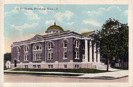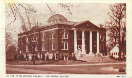 The United Presbyterian Church was founded 29 April 1890 at the home of Mr. and Mrs. J. W. Alexander with 12 charter members. Reverend J. H. Gibson was asked by the Beulah United Presbyterian Church to organize a congregation in Pittsburg where he became the first pastor of the church from 1891 till 1901 when his health forced him to retire. The first congregants met in various homes of members and on the second floor of a building on the northwest corner of Third and Broadway. They were meeting in the old Methodist Church at the corner of 5th and Pine where the Memorial Auditorium is when they built and dedicated a new much larger building on the southwest corner of 4th and Walnut on 21 May 1916. In 1918, Rev. H. Harper Hutchman became the pastor of the United Presbyterian Church and during his first year, the First Congregational Church located at 3rd and Walnut voted to unite with the UP church, starting on February 8, 1919. Rev. Hutchman served until 1940 when he retired at age 78. On January 1, 1986 the two Presbyterian churches in Pittsburg decided to merge and meet in the First Presbyterian Church building at 6th & Pine. The United Presbyterian church property was sold and the building was torn down a few years later with the Roman columns from the front of the church used on the front of the new Sigma Chi Epsilon fraternity house at 1714 S. Broadway across the street from PSU.