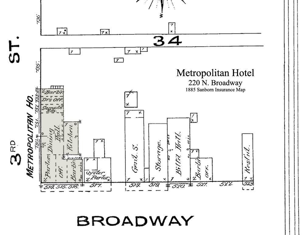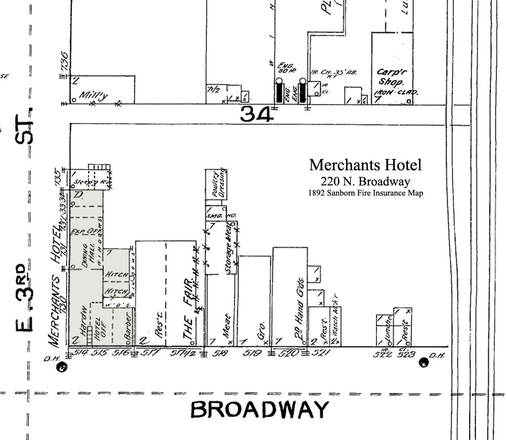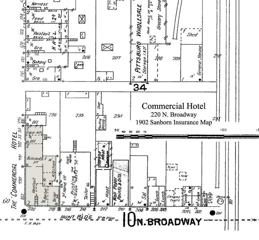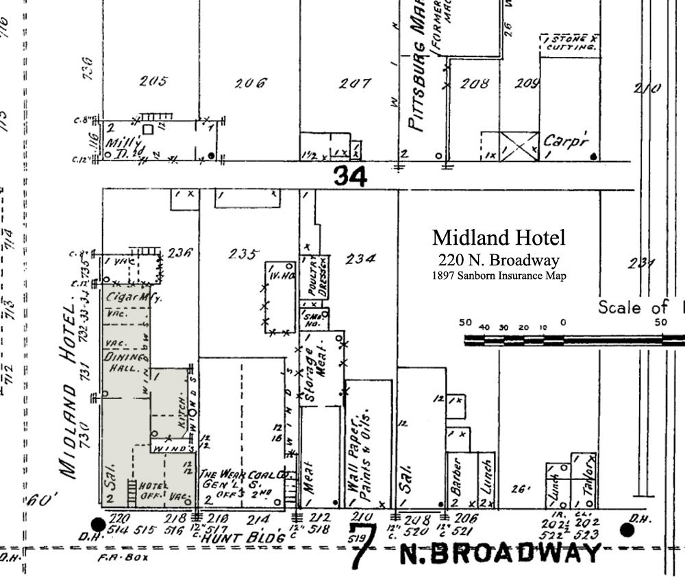 The second story of the brick building at 220 N. Broadway was home to as many as 11 different hotels until it was torn down in 1964. It along with the rest of the block was leveled to make room for the new National Bank of Pittsburg, now Bank of America, which opened on the spot in October 1966. Starting with the Metropolitan Hotel in about 1885 it was followed by Hotel Cissna around 1887, which was owned and ran by proprietress, Mrs. S. E. Cissna. Between 1892 and 1900 it changed hands 3 times as the Merchants Hotel, once again becoming the Hotel Cissna and then the Midland Hotel. In 1901 it became the Commercial Hotel and stayed as one of the premier hotels in town till 1923 when it became the Midland Hotel again under the ownership of Mrs. Mary McKee and Mrs. Katherine Ralston followed by Jesse T. Cable. Other names it was known as include the Hotel Virginia (c1930-1933), Hotel Pittsburg (c1936-1939), the New Hotel Inn (c1940-1946), the Hotel Inn (c1947-1955) and finally the O'Neal Hotel, which was painted pale yellow, from 1956 until the demolition in 1964. The above insurance maps show that the building really didn't change much from 1885 until 1902 with only the types of business on the first floor changing hands. |