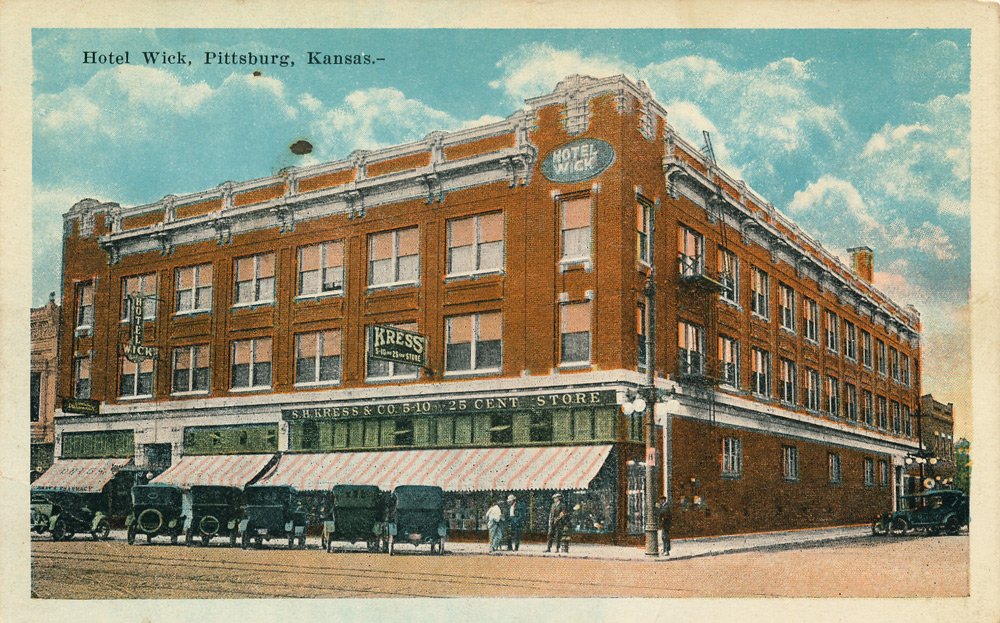| The Wick Hotel was located on the second and third floors of the Kirkwood Building on the southwest corner of Seventh and Broadway. The building was built by Archibald B. Kirkwood, president of the Standard Mercantile Company & local mining businessman, on the site of his store which had burned down in 1911. The new building became known as the Kirkwood Building. The S. H. Kress Five & Dime Store occupied the first floor, opening October 4, 1912. The Wick Hotel, which occupied the second and third floors of the building, was opened around 1923 by Parson's businessman H. O. Wick. He managed the hotel until about 1928 when Mrs. Ida M. Kirkwood, widow of A. B. Kirkwood, took over management and it was renamed the Kirkwood Apartments. |