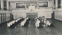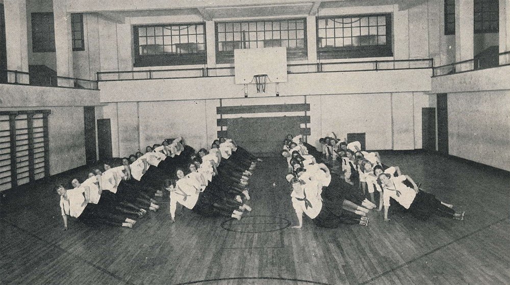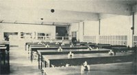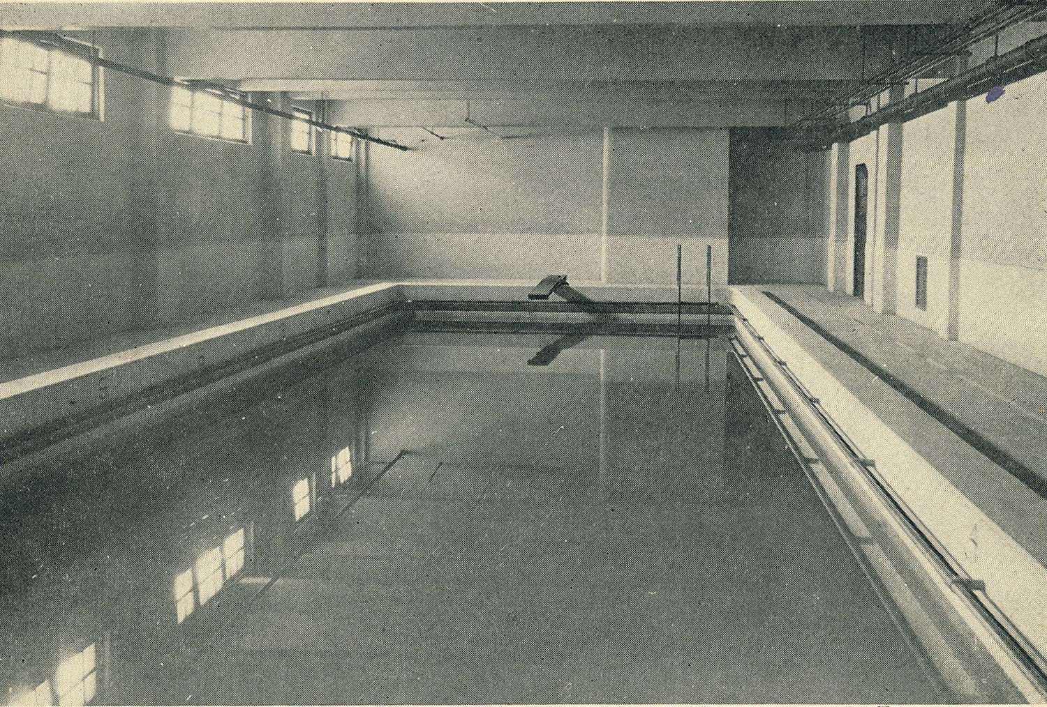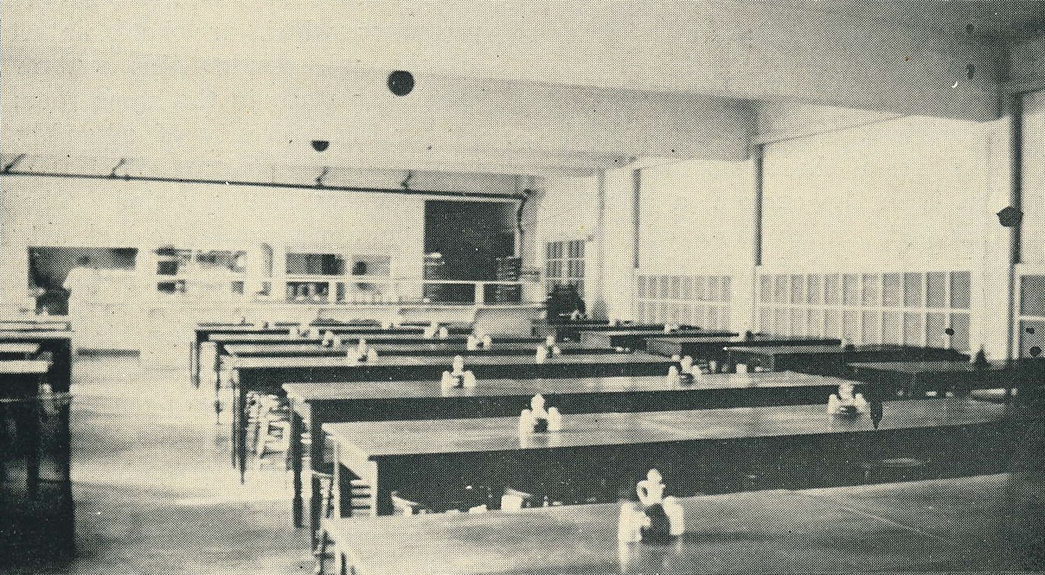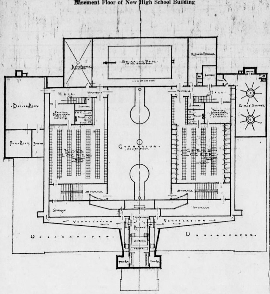 The ground floor, which could be entered through doors under the main entrance stairs or on the north and south sides of the building, was divided into a 50’ x 60’ cafeteria and kitchen and classrooms for both the girls’ domestic science and domestic art and the boys manual work which included printing, woodwork, painting, metal turning, forging and foundry. The floor also included 2 balconies for the gymnasium.