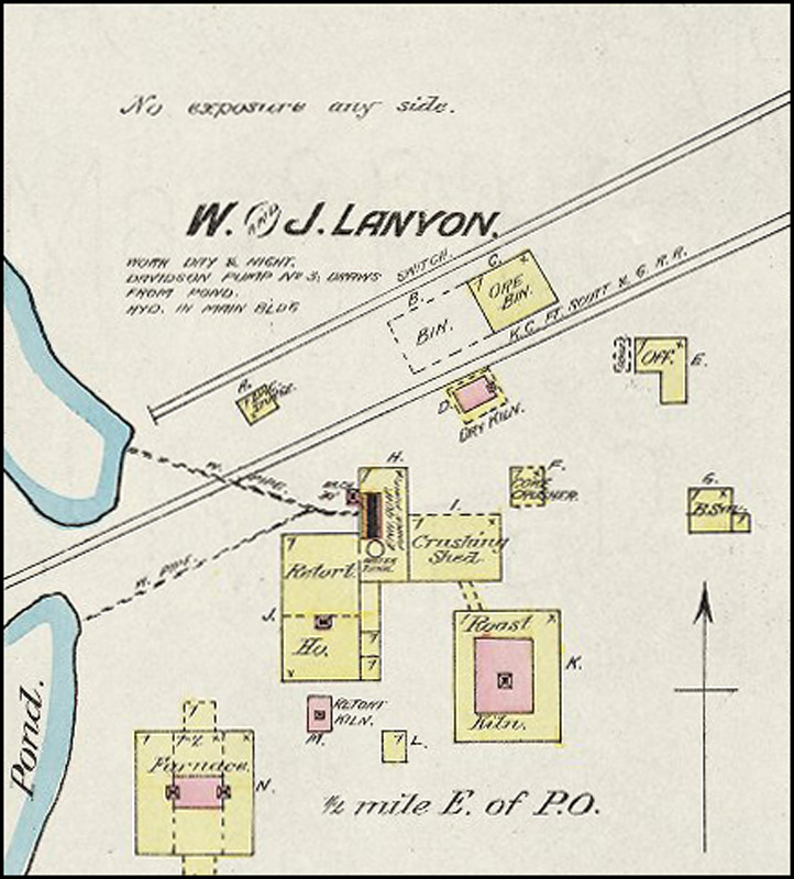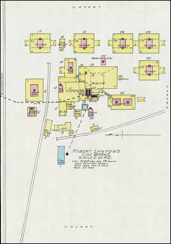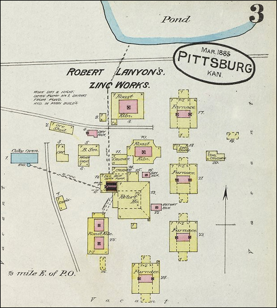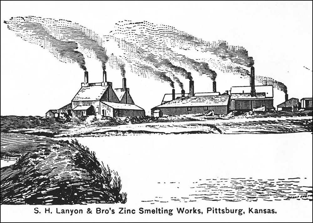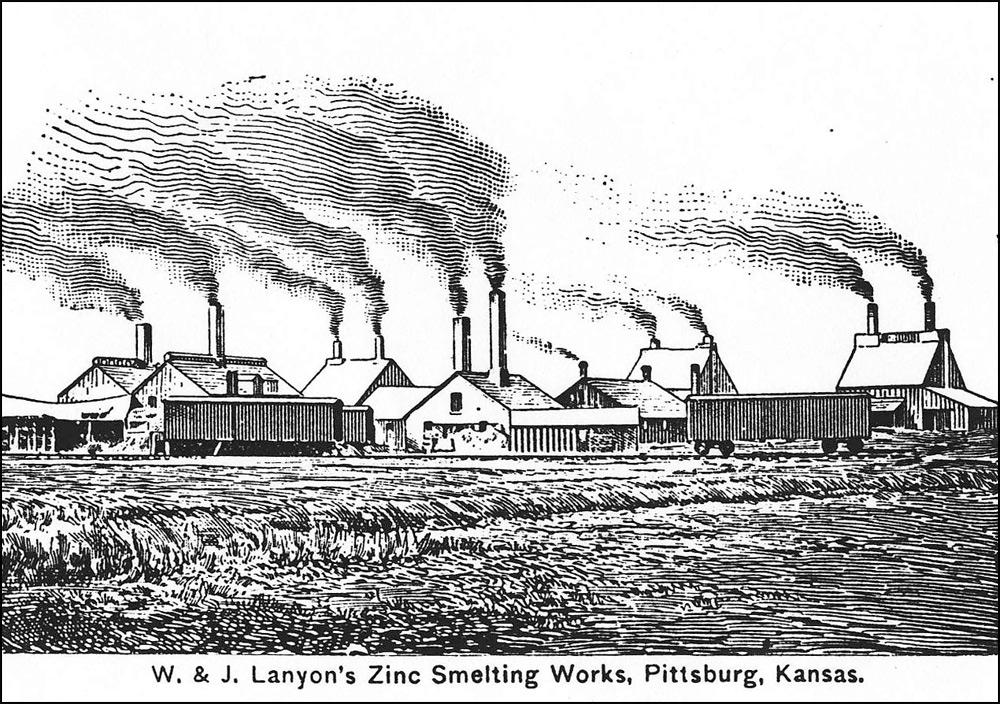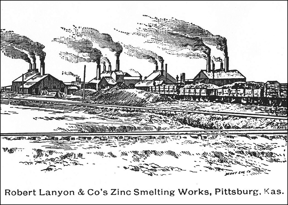 British born Robert Lanyon arrived in the Pittsburg area in the winter of 1878 from his home in La Salle, IL to research the area for the possibility of building a zinc smelter. After finding the area near Pittsburg suitable for the industry due to the abundance of coal, he and his brother S. H. Lanyon built a smelter and named it the Robert Lanyon & Co.'s Zinc Works. It was located just east of the Pittsburg city limits at the time in the area south of Second and Joplin. It began with 2 furnaces, one of which was an 8-kiln Belgian type that had been dismantled and brought to Pittsburg on a train from their smelter in Illinois. In 1880 S. H. Lanyon decided to leave the partnership with his brother and build his own smelter just east of Robert’s called the S. H. Lanyon and Bro. Smelter. That same year William Lanyon, Robert and S. H.’s brother, came to Pittsburg with his son Josiah and opened the W. & J. Lanyon Smelter a little further east in the area around East Fourth where Mission Clay and Schlanger Park is today. Edwin V. Lanyon, Josiah’s son came to Pittsburg a couple of years later and helped his father manage the smelter until 1897. Edwin later became President of the National Bank of Pittsburg and President of the Pittsburg Zinc Co.