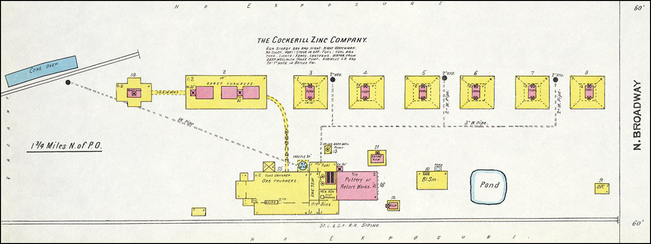The Cherokee-Lanyon Smelter Co. in 1904 sold the North Smelter to local businessmen J. D. Smith and C. A. Miller. Smith and Miller then sold the works to the Pittsburg Mining and Smelting Co., which reopened the facility with 10 furnaces. The North works were operated by the Cockerill-Zinc Co. the outcome of a merger in 1908 of several smelter works in Southeast Kansas and at one time operated both the North and East Smelters.