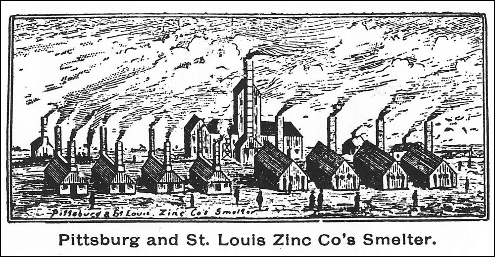 In 1882 the Granby Mining and Smelting Co., that owned zinc mines in the Joplin area, built a smelter north of downtown in an area bound by North Broadway on the east, Olive Street on the west, 11th Street on the south and 18th Street on the north. Today the area is bisected by Walnut Street and Pine Street going north to south with the former McNally’s the old National Guard Armory and the old Census Bureau buildings within the footprint of the smelter property. In the fall of 1889 the Weir City Zinc Co. and the Pittsburg & St. Louis Zinc and Land Co. wanted to build smelters in Pittsburg but they wanted assistance and a bonus for locating in the area. They entered into a contract with the Board of Trade of Pittsburg for a $15,000 building bonus each. Construction on both plants began in 1890 with both smelters at full operation in a few months. The Cherokee Zinc Co., also known as the North Smelter, was built north of town in the area where Home Depot is now and the St. Louis & Pittsburg Zinc Co., known as the East Smelter, built northeast of town in the vicinity of 23rd and Michigan.