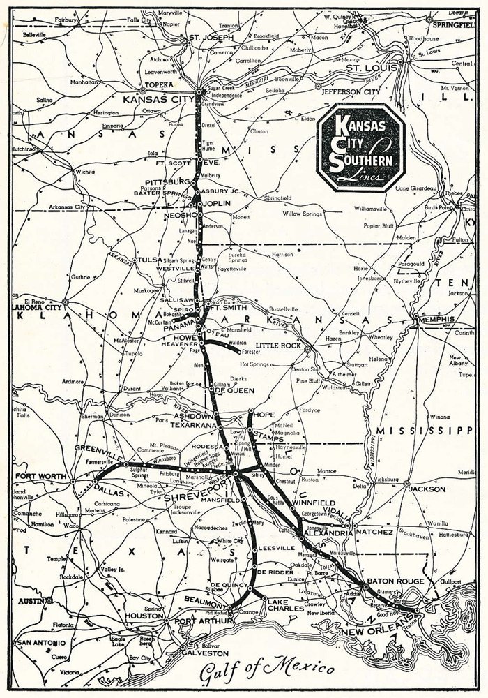 "When the Kansas City Southern Railway was building down from Kansas City in the early nineties, Arthur Stilwell, who conceived the line as a short route for the exportation of Midwestern products, platted his course in a straight line between Kansas City and Joplin, then on to the Gulf of Mexico.